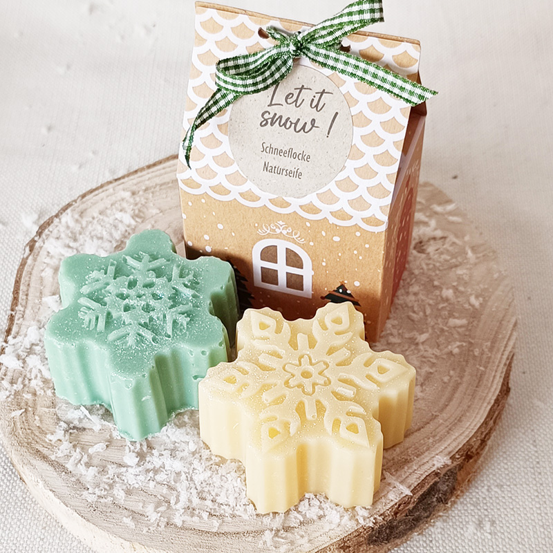 Diese Seife in Form einer Schneeflocke mit Glitzer zaubert Weihnachtsstimmung in deinem Bad.