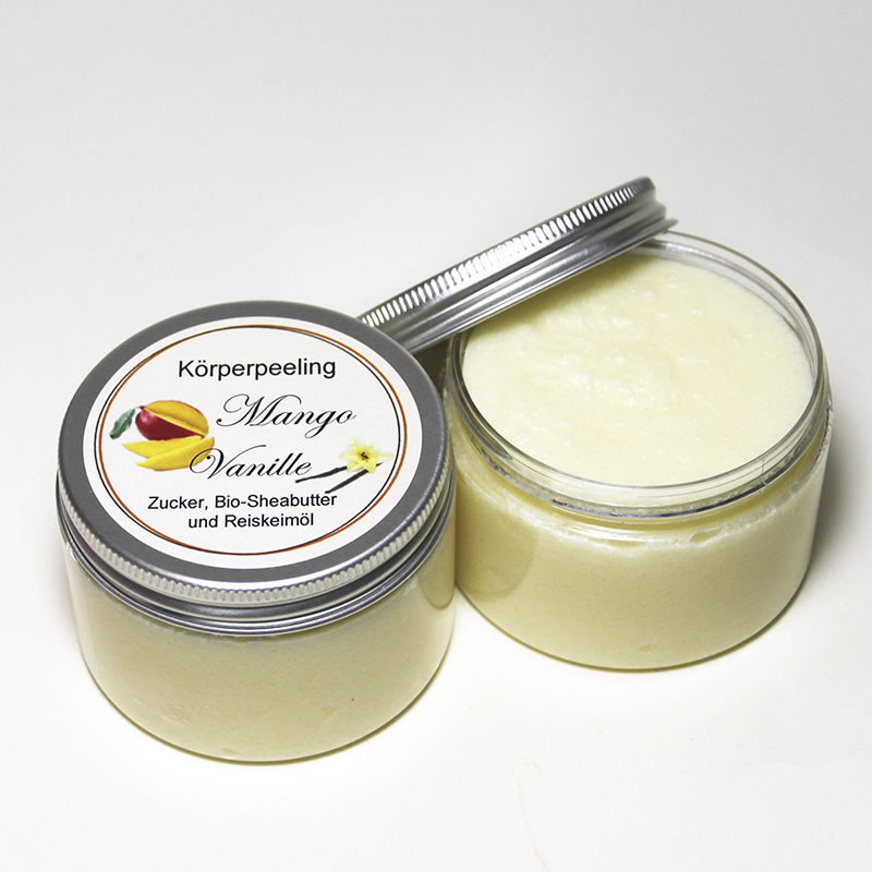Zuckerpeeling und Body-Lotion in einem. Pflegend mit Bio-Sheabutter, Reiskeim- und Jojobaöl.