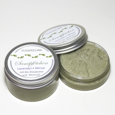 Fußpeeling mit Meersalz, reinigend und pflegend mit Bio-Shea- und Kakaobutter, grüner Tonerde, Avocado- und Bio-Olivenöl und reinen ätherischen Ölen